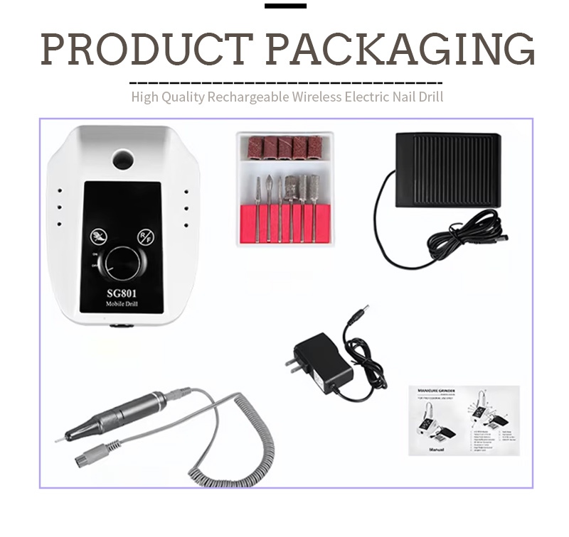 Вміст цієї портативної електричної дрилі для гелевих нігтів зі швидкістю 35 000 обертів на хвилину містить шліфувальну ручку, USB-кабель для зарядки, інструкцію з експлуатації продукту та легку портативну коробку.