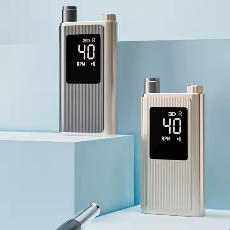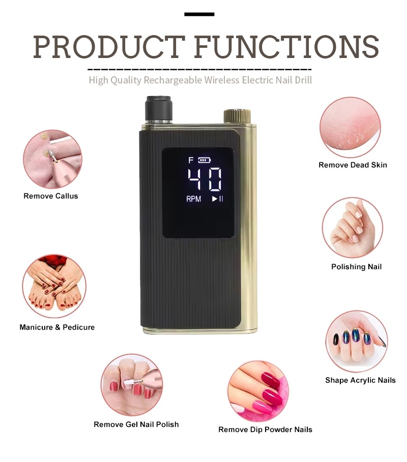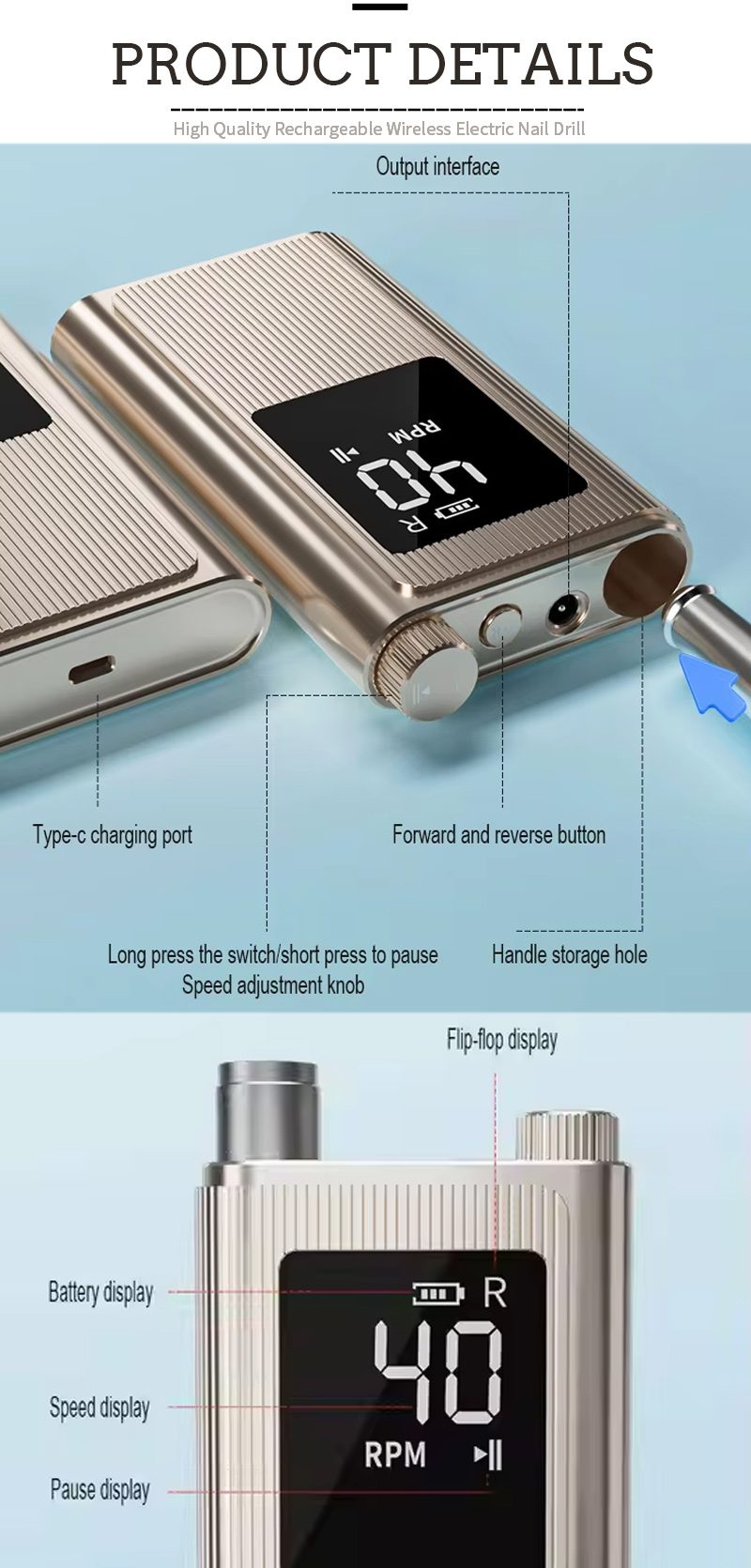 Конструкція дисплея цієї високошвидкісної професійної дрилі для нігтів зі швидкістю 40 000 обертів на хвилину має перемикач увімкнення/вимкнення та обертання вперед/назад для загальної активації однією кнопкою, гніздо для швидкої зарядки внизу, змінне гніздо для свердла вгорі та трипозиційне регулювання швидкості для задоволення різноманітних потреб.