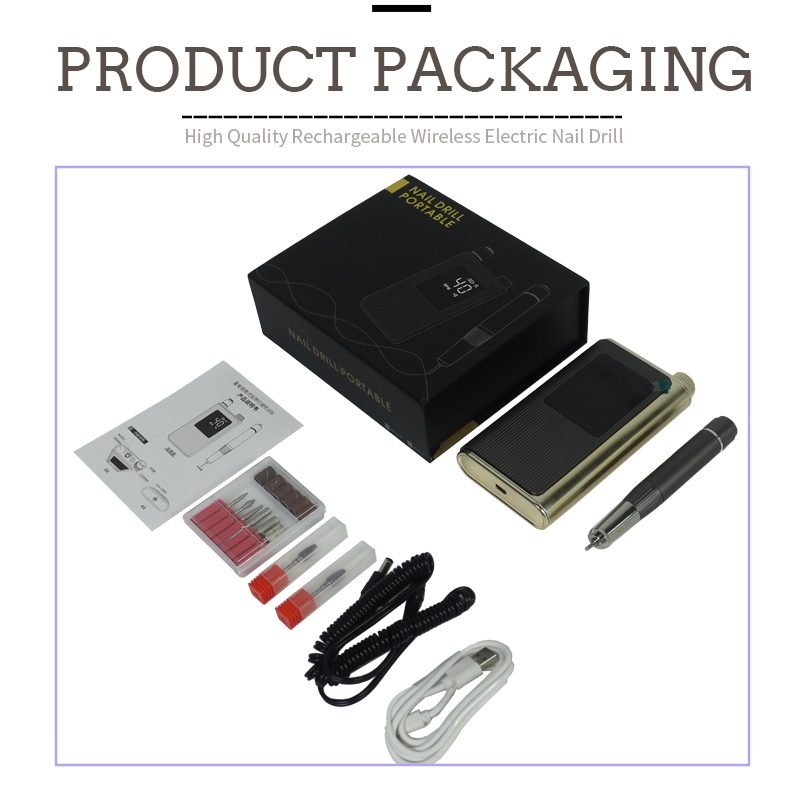 Вміст цієї високошвидкісної професійної дрилі для нігтів на 40 000 обертів на хвилину містить шліфувальну ручку, USB-кабель для заряджання, інструкцію з експлуатації та легку портативну коробку.