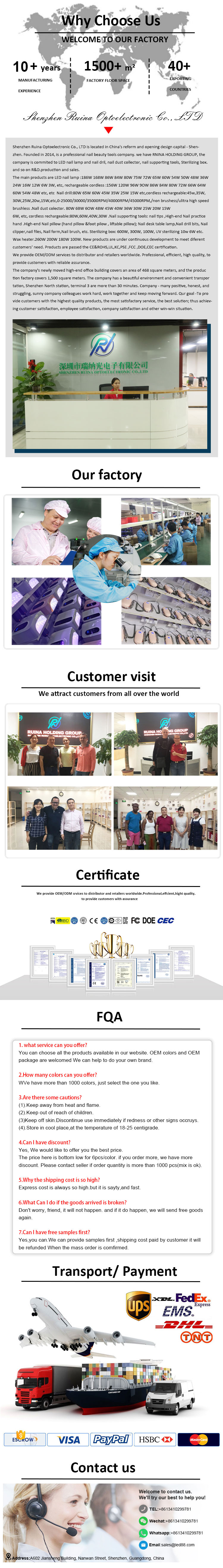 Новий стиль вигнута голова зчеплення нігтів для нігтівShenzhen Ruina Optoelectronic Co., Ltd. провідний китайський виробник, постачальник і експортер електричного засобу для зняття гелю з нігтів. Дотримуючись прагнення до бездоганної якості продукції, так що наш електричний засіб для зняття гелю з нігтів був задоволений багатьма клієнтами. Екстремальний дизайн, якісна сировина, висока продуктивність і конкурентоспроможна ціна – це те, чого хоче кожен клієнт, і це також те, що ми можемо вам запропонувати. Звичайно, також важливим є наше ідеальне післяпродажне обслуговування.
