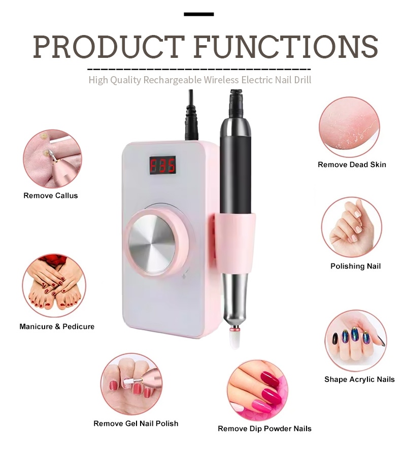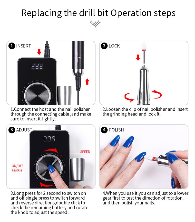 Цей відлущувальний 35 000 обертів на хвилину електричний свердло для нігтів замінний метод роботи свердла, тобто, підключіть і витягніть, легко і зручно, заміна може бути використана після завершення.