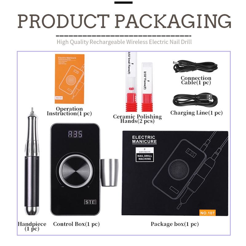 Вміст цієї відлущуючої електричної дрилі для нігтів зі швидкістю 35 000 обертів на хвилину містить шліфувальну ручку, USB-кабель для заряджання, інструкцію з експлуатації продукту та легку портативну коробку.