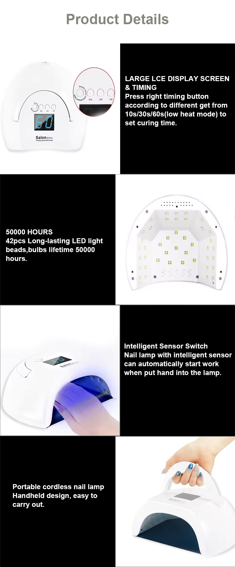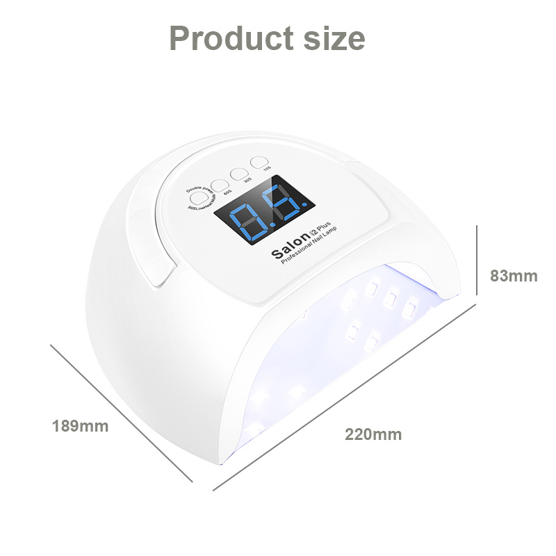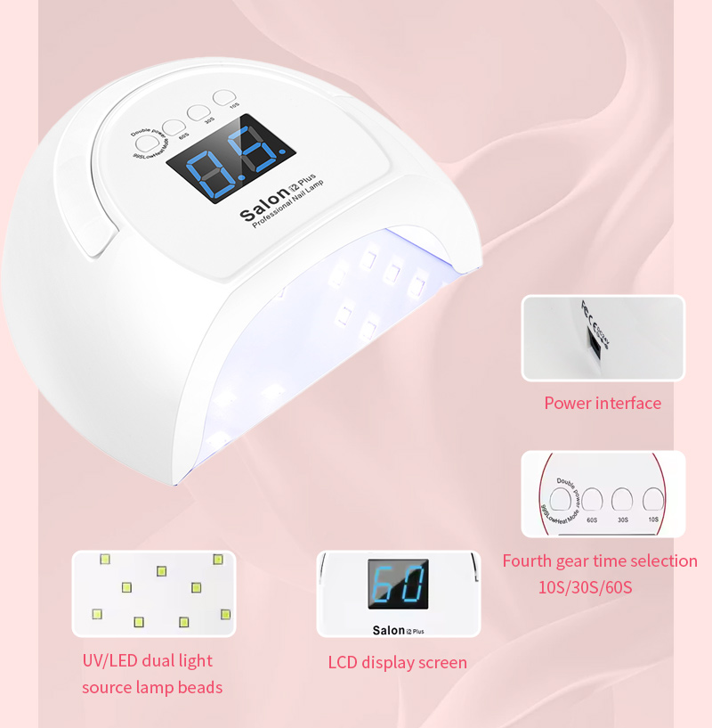 Засіб забезпечує рівномірне висихання клею без усадки. Його подвійні джерела світла забезпечують м’яке нагрівання, щоб запобігти знебарвленню рук і напрузі очей, підходить як для рук, так і для ніг, забезпечуючи неймовірно швидкі результати висихання.