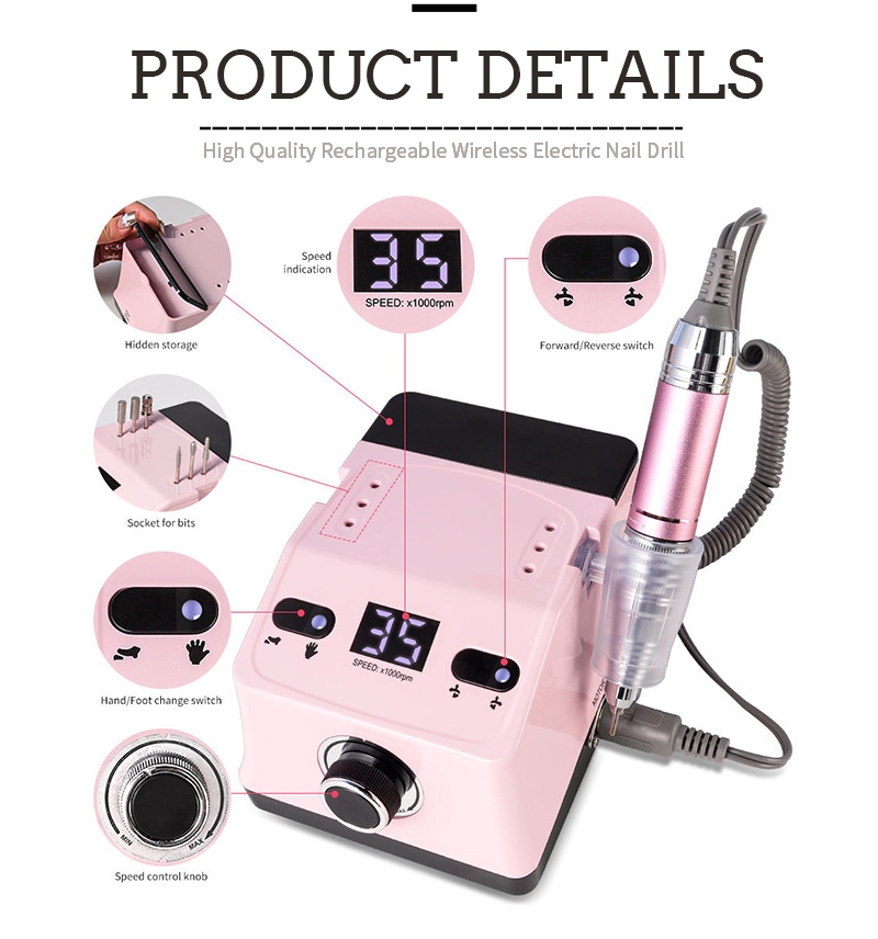 Конструкція дисплея цієї ручної дрилі та полірувальника для нігтів має перемикач увімкнення/вимкнення та обертання вперед/назад для загальної активації однією кнопкою, гніздо для швидкої зарядки внизу, змінне гніздо для дрилі вгорі та трипозиційне регулювання швидкості для задоволення різноманітних потреб.