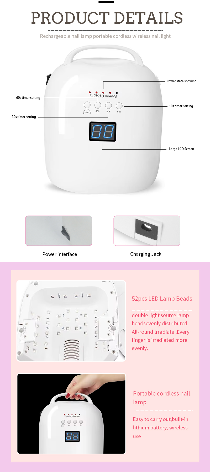 Продукт забезпечує навіть висихання клею без усадки. Її подвійні джерела світла забезпечують ніжне нагрівання, щоб запобігти знебарвленню рук та напруженню очей, придатних для рук, і ніг, що забезпечує надзвичайно швидкі результати сушіння.
