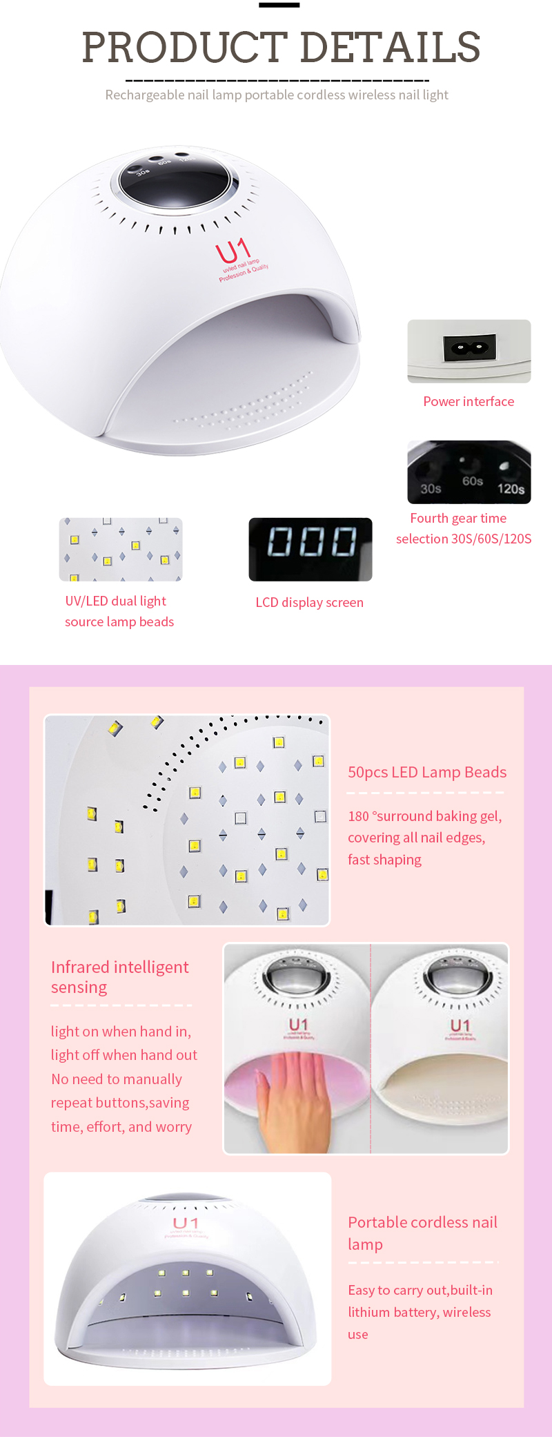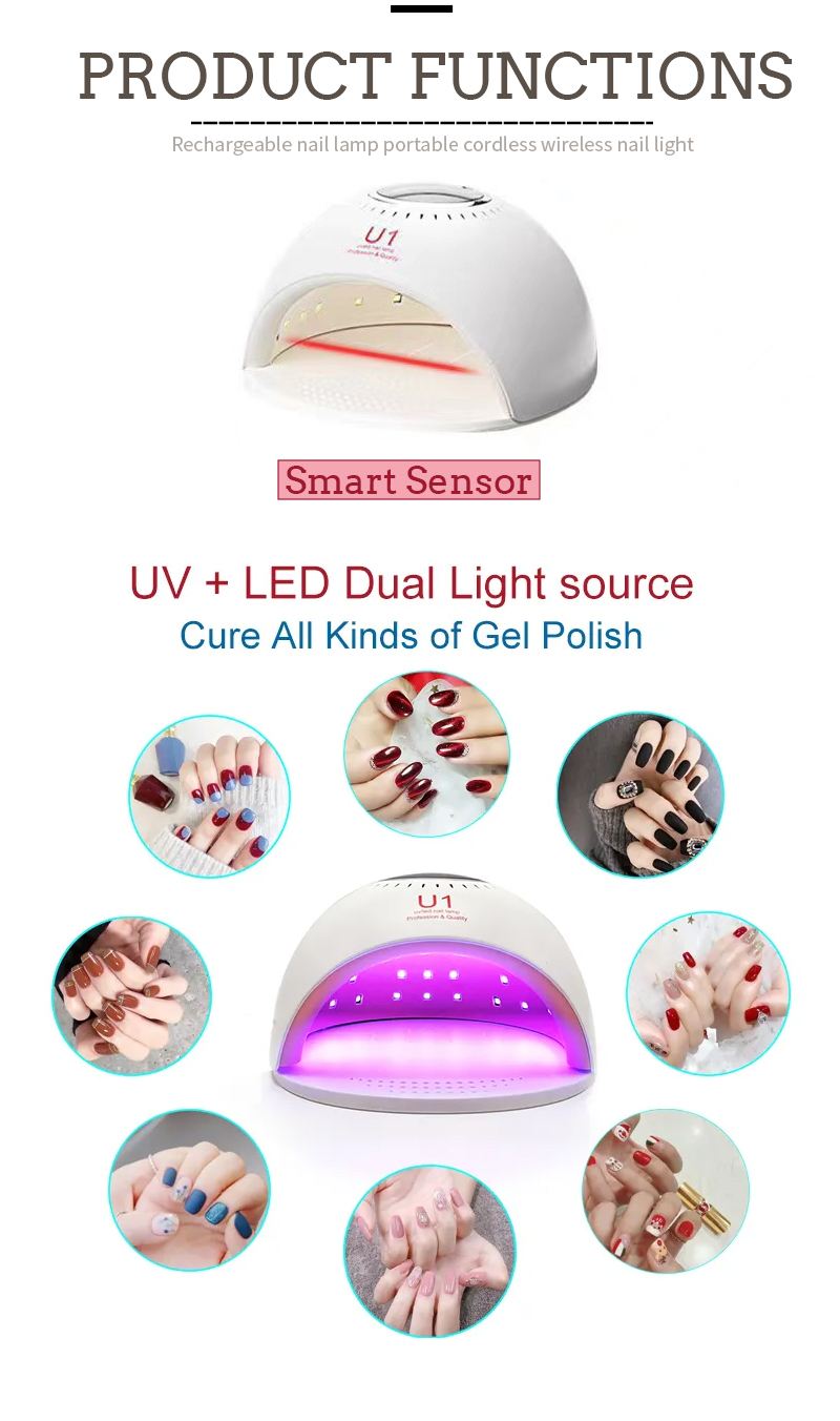 Засіб забезпечує рівномірне висихання клею без усадки. Його подвійні джерела світла забезпечують м’яке нагрівання, щоб запобігти знебарвленню рук і напрузі очей, підходить як для рук, так і для ніг, забезпечуючи неймовірно швидкі результати висихання.