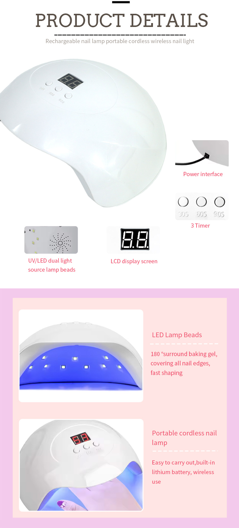 Продукт забезпечує навіть висихання клею без усадки. Її подвійні джерела світла забезпечують ніжне нагрівання, щоб запобігти знебарвленню рук та напруженню очей, придатних для рук, і ніг, що забезпечує надзвичайно швидкі результати сушіння.