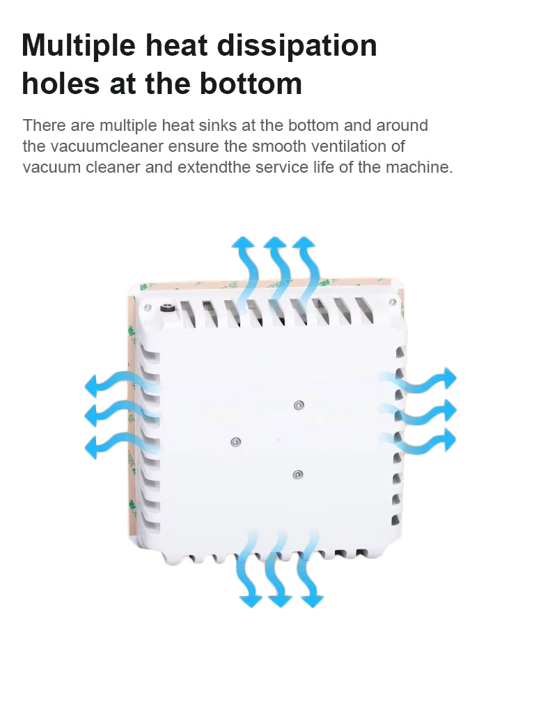 У нижній частині продукту є отвори для охолодження для плавної вентиляції, а пилосос розроблено з кількома вентиляційними отворами для охолодження внизу та навколо, щоб забезпечити плавну вентиляцію та подовжити термін служби машини.
