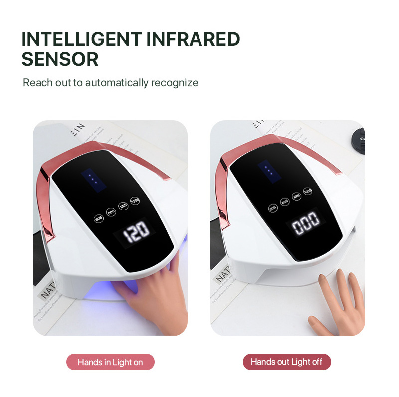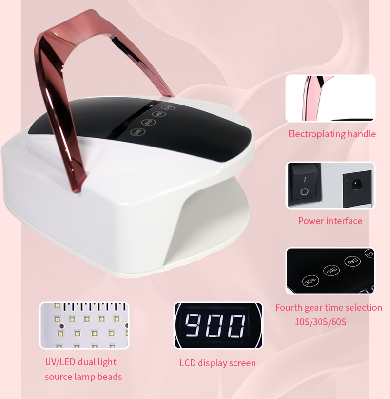 Засіб забезпечує рівномірне висихання клею без усадки. Його подвійні джерела світла забезпечують м’яке нагрівання, щоб запобігти знебарвленню рук і напрузі очей, підходить як для рук, так і для ніг, забезпечуючи неймовірно швидкі результати висихання.