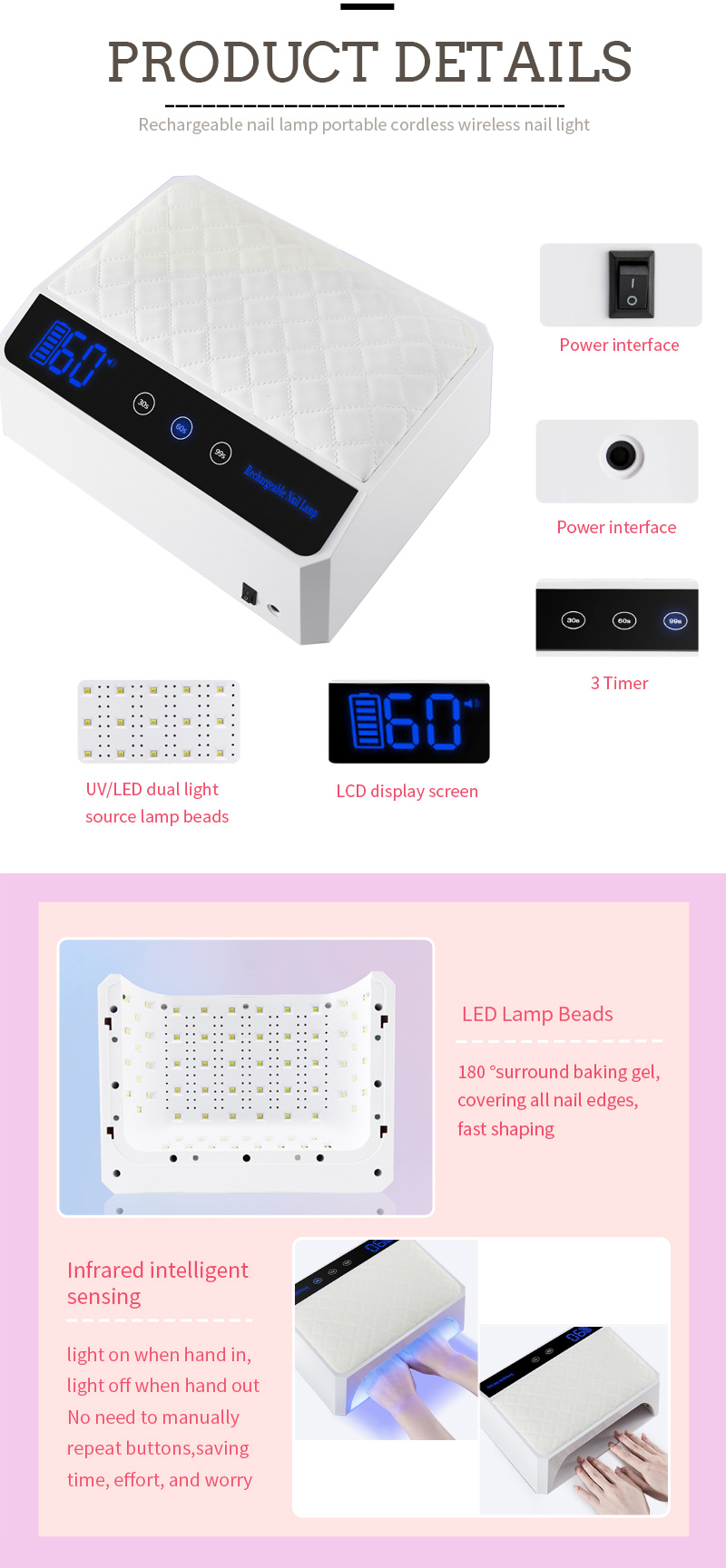 Продукт забезпечує навіть висихання клею без усадки. Її подвійні джерела світла забезпечують ніжне нагрівання, щоб запобігти знебарвленню рук та напруженню очей, придатних для рук, і ніг, що забезпечує надзвичайно швидкі результати сушіння.