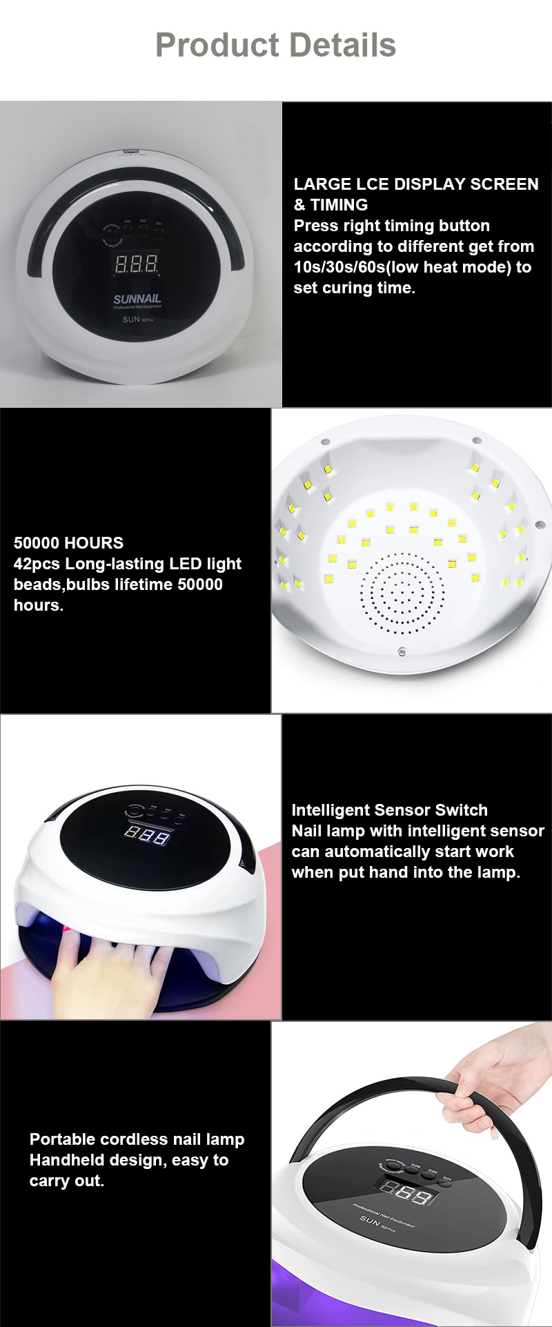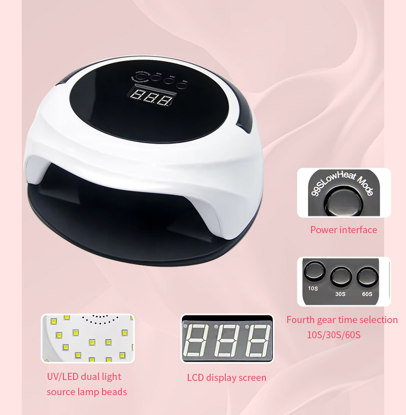 Лампа для сушіння нігтів із функцією автоматичного датчика оснащена технологією інфрачервоного інтелектуального датчика, яка автоматично світиться, коли руки наближаються, і вимикається, коли руки віддаляються, усуваючи клопоти про повторне натискання кнопок і економлячи час і зусилля. Потужний клей для випічки не вимагає тривалого очікування, заощаджуючи час і зусилля.