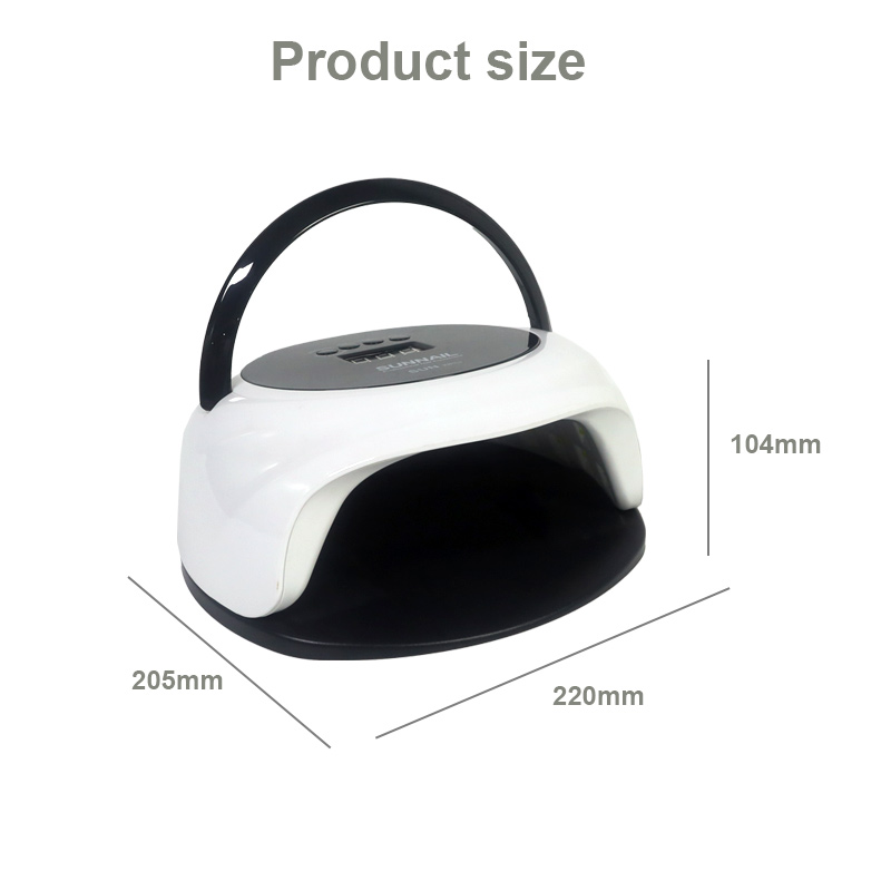 Розміри лампи для сушіння нігтів з функцією автоматичного сенсора - 205 мм в довжину, 220 мм в ширину і 104 мм у висоту, з великою потужністю і можливістю використовувати як руки, так і ноги, що дуже зручно.