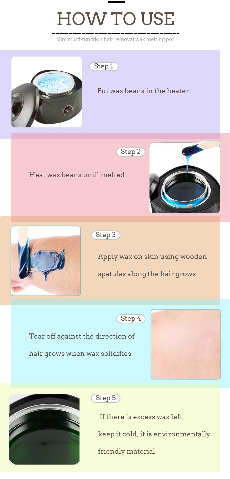 Метод роботи продукту з воском для депіляції, чим вища температура, тим швидше тане віск, чим нижча температура, тим повільніше тане віск, спочатку налийте відповідну кількість воскових зерен для депіляції, нагрівайте, поки воскові зерна не розтануть, потім депіляційні частини воску для депіляції з рівномірним покриттям і, нарешті, відірвіть проти напрямку росту волосся.